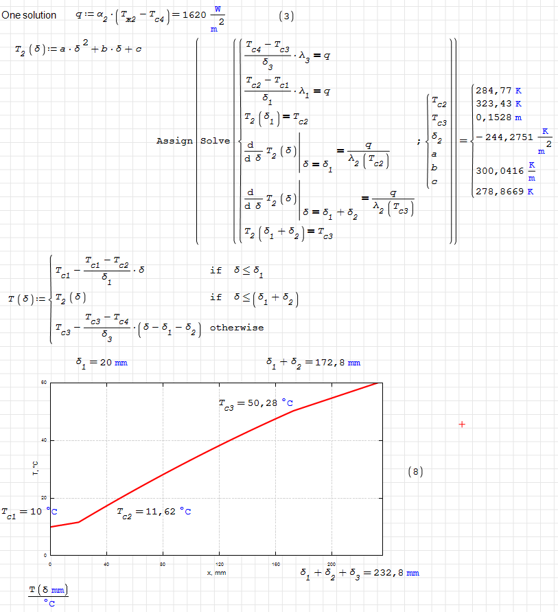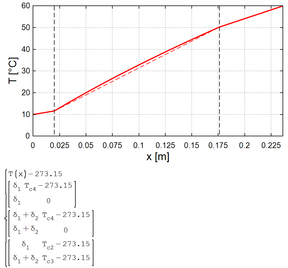 WroteI am trying to plot a temperature field in a three layer wall. There is no problem with the outer layers. But there is a problem in the middle layer - there should be a parabola, not a straight line. How to draw this parabola in the simplest way - with one formula. I know the hard way.