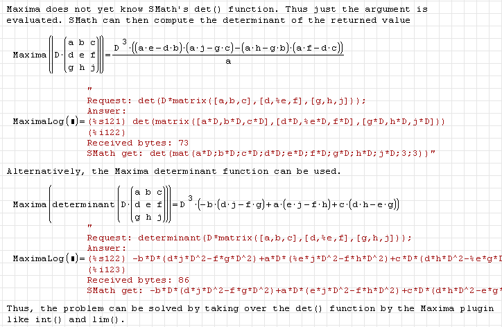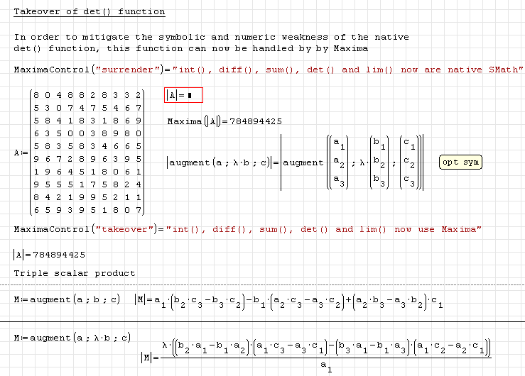 Форум SMath SMath Studio Bugs & Problems symbolic eval of determinant of scaled matrix fails 1 страниц (2 вхождений) symbolic eval of determinant of scaled matrix fails - Сообщения К последнему сообщению #1 Опубликовано: 23.11.2013 13:18:57 Martin Kraska 1 312 сообщений из 2 228 понравились пользователям. Группа: Moderator SMath cannot compute symbolically the determinant of a scaled matrix. Martin KraskaPre-configured portable distribution of SMath Studio: https://en.smath.info/wiki/SMath%20with%20Plugins.ashx #2 Опубликовано: 24.11.2013 14:11:51 Martin Kraska 1 312 сообщений из 2 228 понравились пользователям. Группа: Moderator Issue can be solved by using Update 6 of the Maxima Plugin. Martin KraskaPre-configured portable distribution of SMath Studio: https://en.smath.info/wiki/SMath%20with%20Plugins.ashx 1 страниц (2 вхождений) Новые сообщения Нет новых сообщений