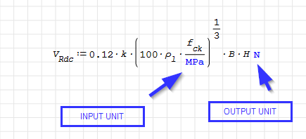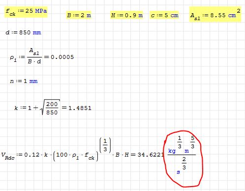 Here, as per definition, f.ck must be entered in [MPa], B and H in [mm], and then the result is returned in [N]; if you do a dimensional analysis, this could work only because the "magic numbers" 100 and/or 0.12 have implicit units.