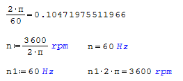 In 3600/(2*pi), it's the 3600 that has units 'rpm'; the 2*pi has units 'rad/rev'? I don't see how the 2*pi modifier can be inserted here and be dimensionless. If we said a:=2*pi and then n:=3600/a, we should ask what is 'a'?