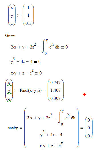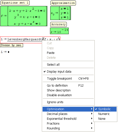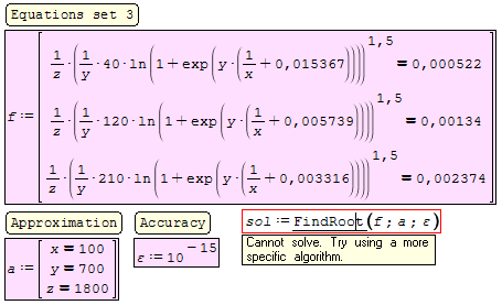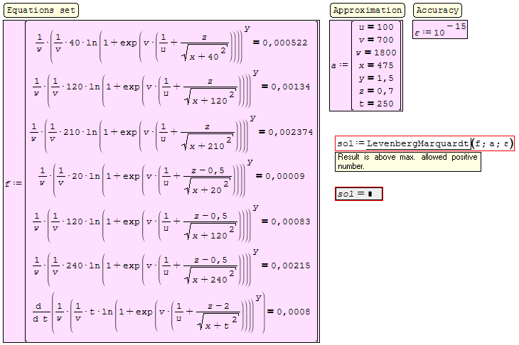 I think it would not be bad for Davide to verify my algorithm (it does not correspond in any case to the syntactic precepts used in SMath) to append it and add it to its other models, from where I saw the Levenberg-Marquardt method missing . I will not have claims. What Martin has suggested to me is useless in this case. In the file below I tried to apply LevenbergMarquardt(3) to the simple example of 3 unknown 3 equations that appears in the picture in message # 54. An error occurred.