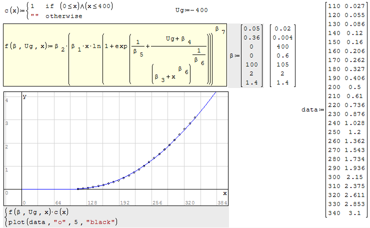 One of the many datasheets of the electronic device in question can be found here: http://www.datasheetspdf.com/pdf-down/E/C/C/ECC83-TESLA.pdf The graphic features I am talking about are on page 12 of the document. The array of data arrays a1, b1, ..., i1 has been sampled by sufficiently accurate methods following those characteristics. My purpose is to determine an applicable set of μ, ka, kg, k, x, y and Uct parameters of the analytical function so as to approximate as accurately as possible those characteristics. I know that SMath may be less than MathCAD, but I would like to find even a less extensive method to achieve approximation. That's why maybe only 5 of the 9 data arrays could be used. Or perhaps even some less epaining methods would be found.