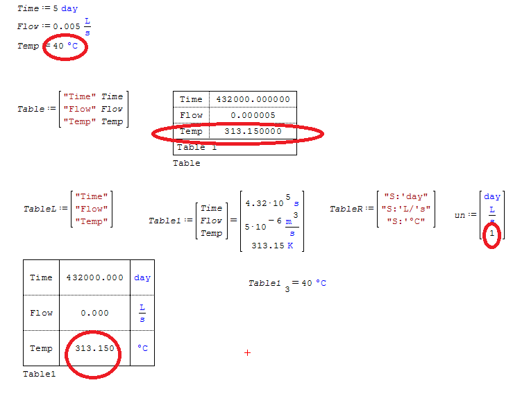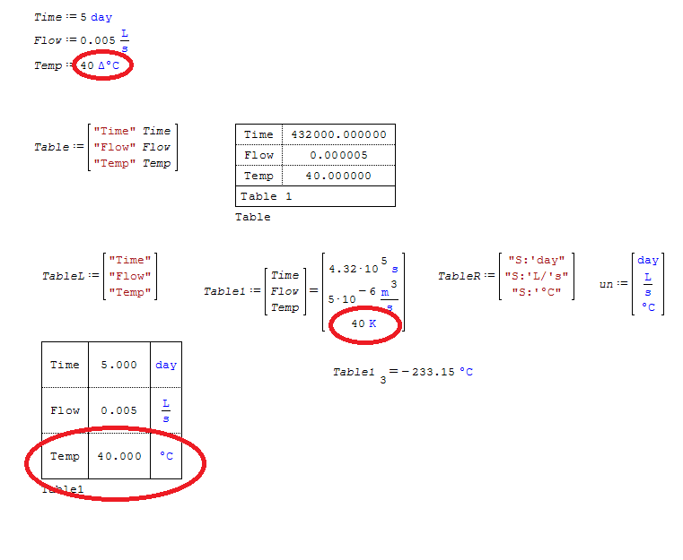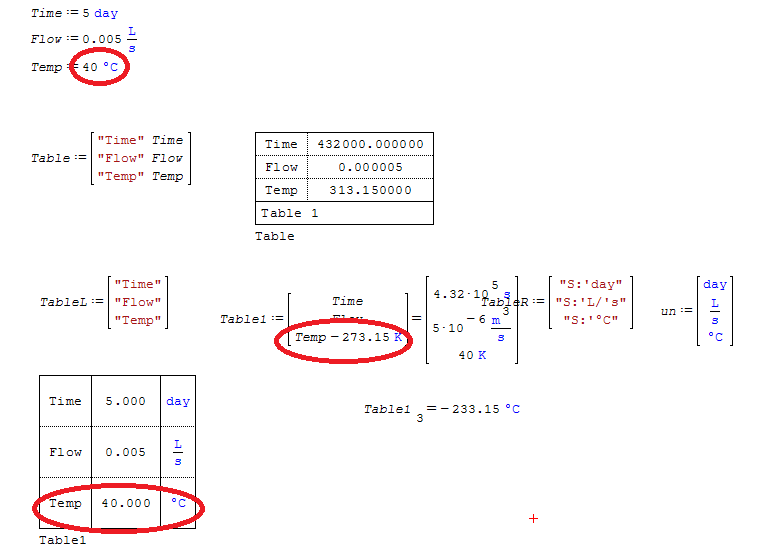 I can produce the correct output (with incorrect input) by changing units of Temp to Δ°C OR by changing value in Table1 to Temp-273.15K.