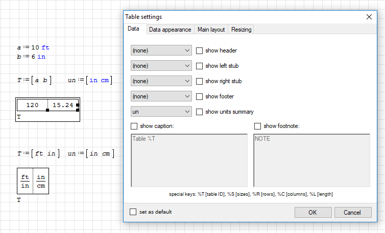 the "in" unit shown in the un matrix is converted to the default unit in the same way the "a" and "b" variables are. Then the un matrix divides the T matrix to cancel out the units and display the values in the units chosen in the un matrix.