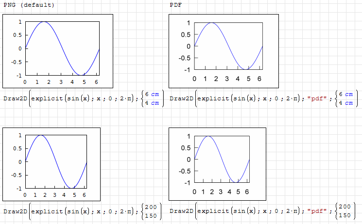 The image shows four image regions with the same graph, format PNG (left) and PDF (right) and size specified in SMath length units (upper) and in pixels (lower). The image regions are reset to original size via context menu. My screen is 96 dpi and at 100% zoom level the scaling is perfect.