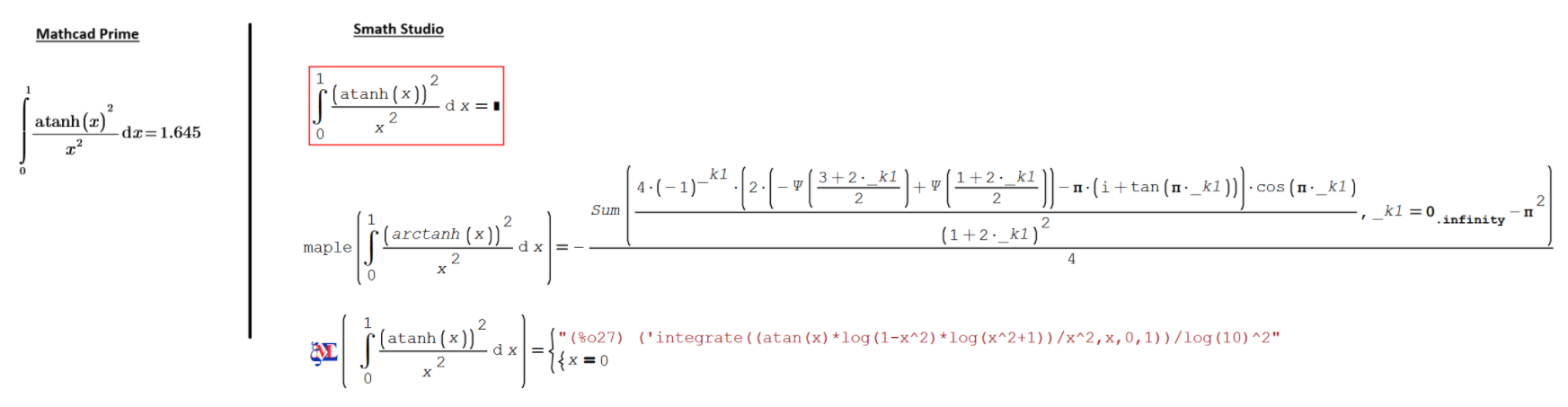 Форум SMath SMath Studio Questions Smath cananot solve this integral No2 while Mathcad Prime can 1 страниц (2 вхождений) Smath cananot solve this integral No2 while Mathcad Prime can - Сообщения К последнему сообщению #1 Опубликовано: 26.12.2024 02:51:46 Cornel 2 сообщений из 78 понравились пользователям. Группа: User Hi,Another integral which Smath cannot solve while Mathcad Prime can: #2 Опубликовано: 26.12.2024 05:20:48 Alvaro 1 078 сообщений из 1 750 понравились пользователям. Группа: User Maple provides the exact solution as an infinity sumatorie. Whether that expression is useful or too unwieldy is another question.Best regards.Alvaro. 1 страниц (2 вхождений) Новые сообщения Нет новых сообщений
