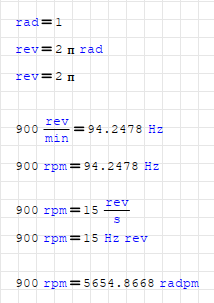 On the other hand, the description of the "radpm" unit is "Radians per minute", but the definition is in "per second". So my 900 revolutions-per-minute component is completing 900 x 2 x pi = 5655 Radians per minute. I expect 5655 radpm to equal 15 Hz, but instead I get 900 radpm = 15 Hz.