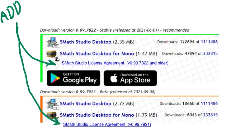 Finally, in light of this whole discussion, having https://en.smath.com/view/SMathStudio/license (or https://ru.smath.com/view/SMathStudio/license) reflect both the current EULA (unaffected) and the new EULA of the NEXT release (currently in beta) is less than ideal; Would it be possible to associate an EULA with its associated version, similar to the following layout?