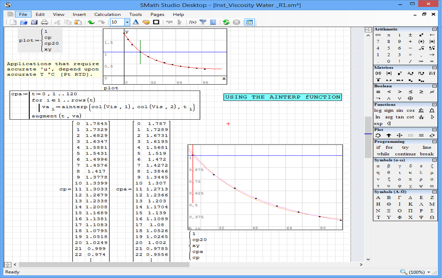 WroteI think for more precision in the calculation of viscosity of water , you should use the interpolation function " ainterp " , applying it directly to the table.