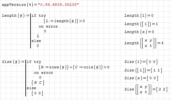 Functions like this Length, and equivalents for Rows and Cols are a standard way in Mathcad to check if one works with matrices or scalars, avoiding the use of IsMatrix (absent in SMath at this time), and saving some program steps.