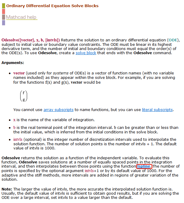 WroteOk, I found a bug in rkfixed() and finally figured out the difference between interpolation functions. In the picture below, I repeated part of the calculations from Mathcad. As you can see, to interpolate the numerical solution of the ODE, a cubic spline is used, linear at the end points.