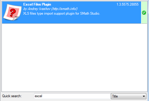 Форум SMath SMath Studio Questions How to find out which plug-in provides a particular export format for entire SMath documents? 1 страниц (2 вхождений) How to find out which plug-in provides a particular export format for entire SMath documents? - Сообщения К последнему сообщению #1 Опубликовано: 23.02.2017 19:05:13 Martin Kraska 1 312 сообщений из 2 228 понравились пользователям. Группа: Moderator It is because the XLSX export seems to be broken and I don't know what extension is responsible. If I try to export my standard export test to XLSX SMath gets into trouble.SaveTest.sm (67,06 КиБ) скачан 641 раз(а). Martin KraskaPre-configured portable distribution of SMath Studio: https://en.smath.info/wiki/SMath%20with%20Plugins.ashx #2 Опубликовано: 23.02.2017 20:35:26 Davide Carpi 1 435 сообщений из 2 913 понравились пользователям. Группа: Moderator I guess it is "Excel file type" plugin by Andrey:BTW it work for me If you like my plugins please consider to support the program buying a license; for personal contributions to me: paypal.me/dcprojects 1 страниц (2 вхождений) Новые сообщения Нет новых сообщений