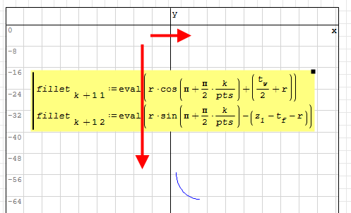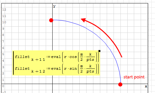 k/pts*pi/2 is the angle at each loop, and increments from 0 to pi/2 as k increments from 0 to pts - You can add pi to the angles above to have the arc with the correct order of points and the right orientation (remember that we are drawing the RHS of the shape)