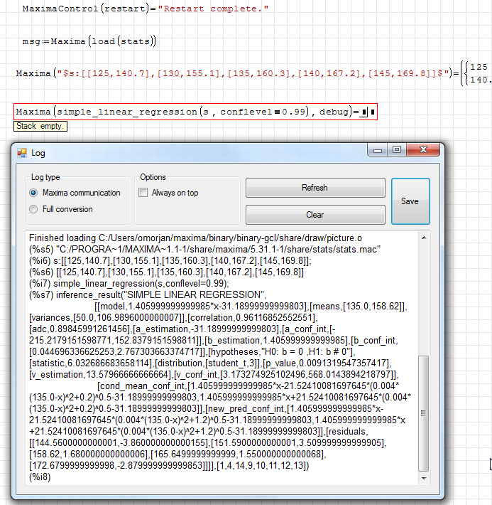 empty stack errors result from back-translation problems (if the result contains nested lists), yet the maxima commands work.