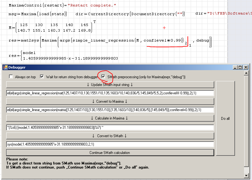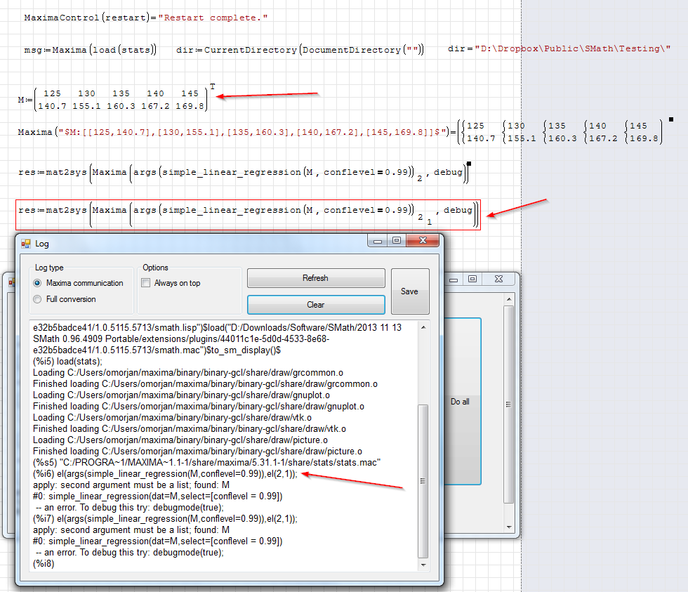 By the way, I tried most of the stats hypothesis testing functions and they work by following your example how to do that. One of them did not work regarding simple linear regression. Here are the test file and the log file as well. From the debug window I had the impression that the calculations performed well, but there is no SMath output (again "stack empty" error).