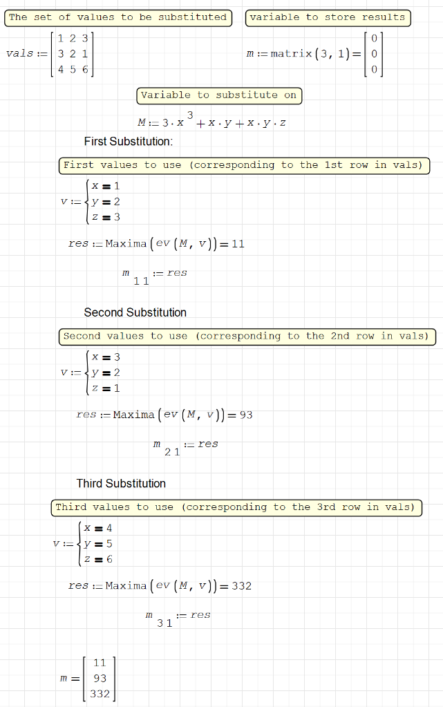 As you can see, I am using Maxima plugin and the Maxima function ev() to substitute values in the symbolic variable. I have some specific questions: