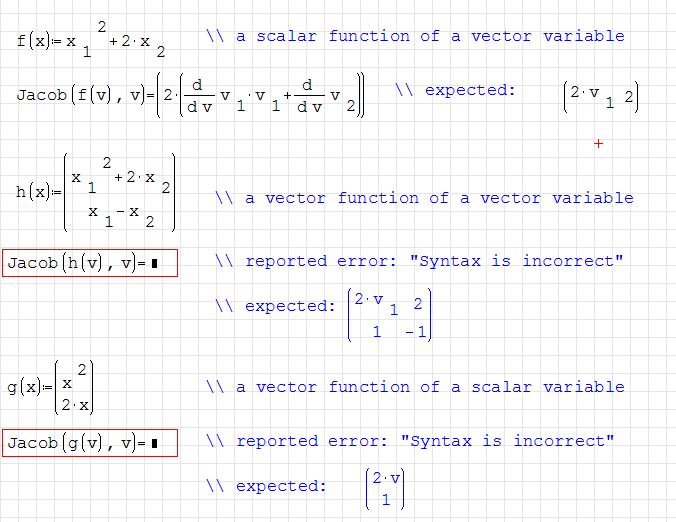 Форум SMath SMath Studio Bugs & Problems Jacobian not working properly? 1 страниц (3 вхождений) Jacobian not working properly? - mb10 - Сообщения К последнему сообщению #1 Опубликовано: 28.08.2013 05:26:30 mb10 9 сообщений из 20 понравились пользователям. Группа: User May be I'm not using the Jacobian function in the appropriate way, but it seems to me it does not behave as expected.See below.EDIT: SMath version: 0.96 - build 4909 Jacobian.sm (9,22 КиБ) скачан 773 раз(а). #2 Опубликовано: 28.08.2013 08:18:33 Martin Kraska 1 312 сообщений из 2 228 понравились пользователям. Группа: Moderator You may consider using the function Jacobian from the Nonlinear Solvers plugin by Davide Carpi. Jacobian_testing.sm (9,8 КиБ) скачан 791 раз(а). Martin KraskaPre-configured portable distribution of SMath Studio: https://en.smath.info/wiki/SMath%20with%20Plugins.ashx #3 Опубликовано: 28.08.2013 09:05:34 mb10 9 сообщений из 20 понравились пользователям. Группа: User Thanks. 1 страниц (3 вхождений) Новые сообщения Нет новых сообщений