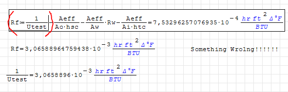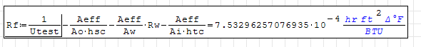 Rf:1/Utest-Aeff/{Ao*hsc}-Aeff/Aw*Rw-Aeff/{Ai*htc}=7.53296257076931*10^{-4}@{'hr*'ft^2*'Δ°F}/'BTU