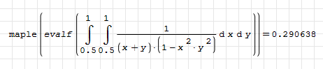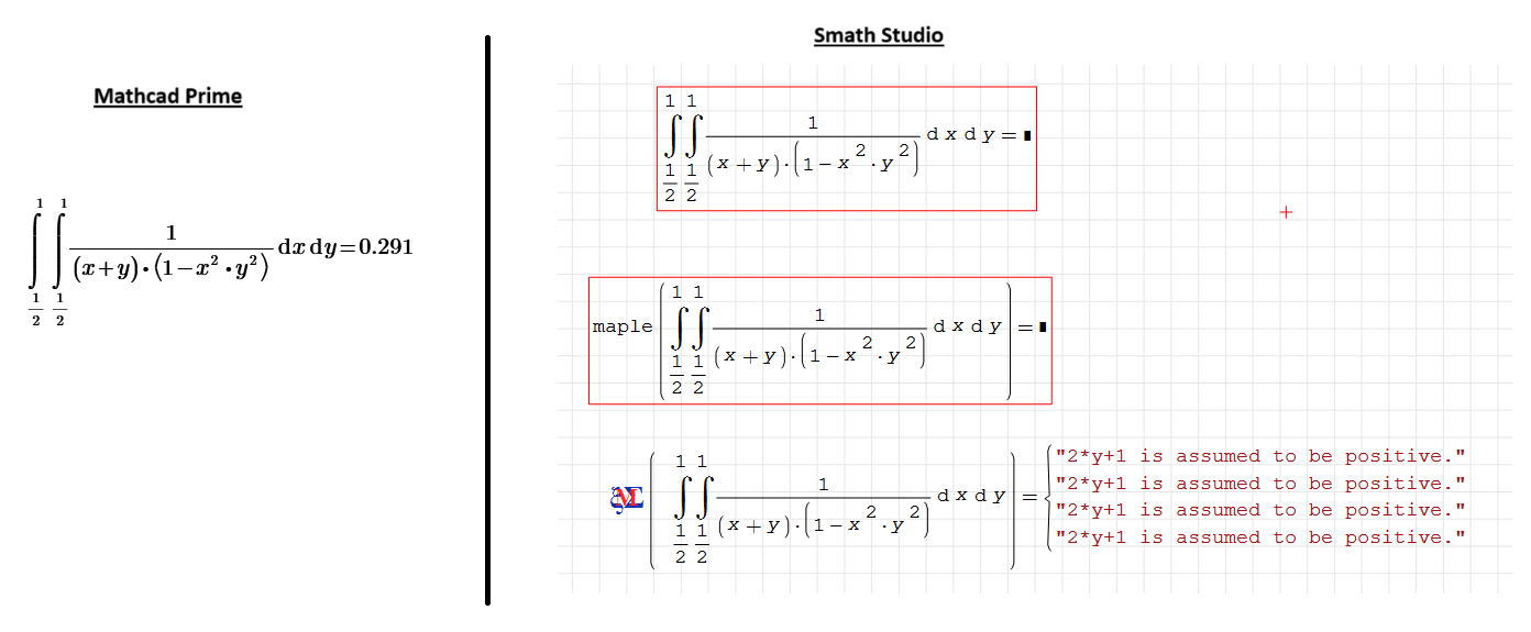 Форум SMath SMath Studio Questions Smath cannot calculate numerically this double integral 1 страниц (2 вхождений) Smath cannot calculate numerically this double integral - Сообщения К последнему сообщению #1 Опубликовано: 26.12.2024 02:08:29 Cornel 2 сообщений из 78 понравились пользователям. Группа: User Hi, #2 Опубликовано: 26.12.2024 05:15:54 Alvaro 1 078 сообщений из 1 750 понравились пользователям. Группа: User 1 страниц (2 вхождений) Новые сообщения Нет новых сообщений