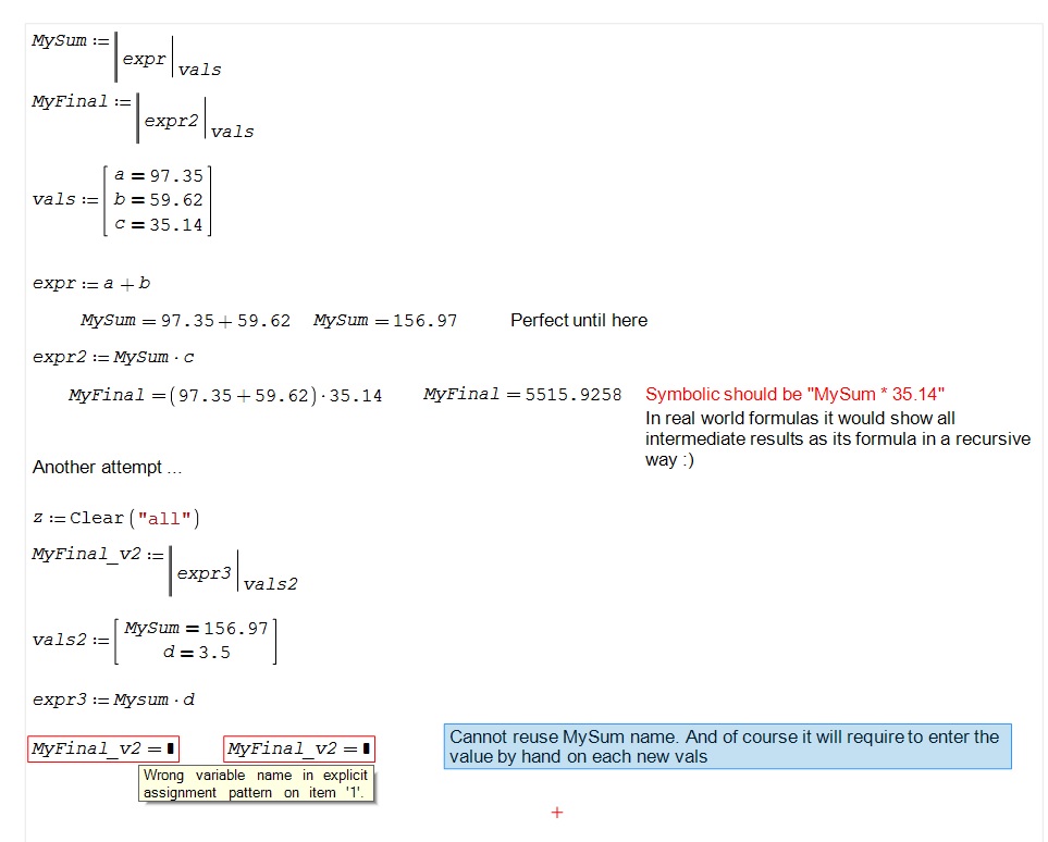 Cannot put all values in a single vals, the simbolic substitution will show in the second formula the formula (not the value) of the calculated value (ee).
