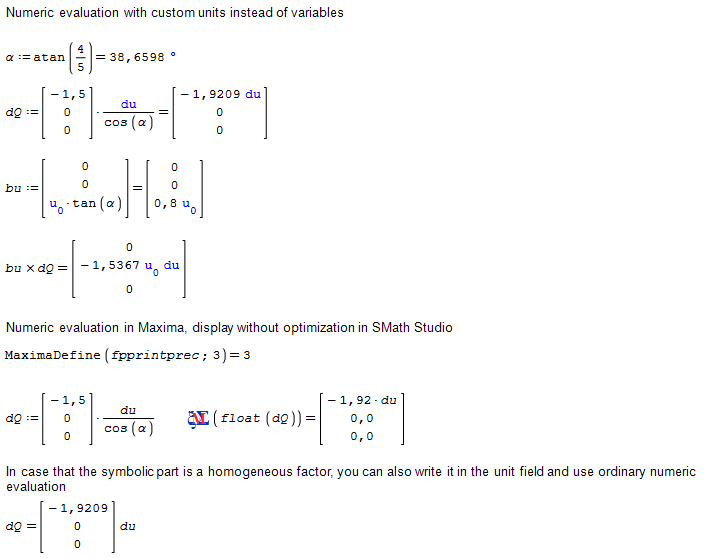 - using custom units. Units are handled symbolically even in numeric evaluation by SMath. Disadvantage is that there may be clashes with pre-defined units. That is why I had to write 'u.0 instead of 'u.