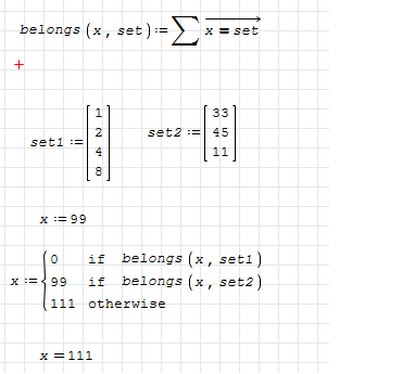 if x "belongs to" {1, 2, 4, 8} else if x "belongs to {33, 45, 11) then x=99 else x=111