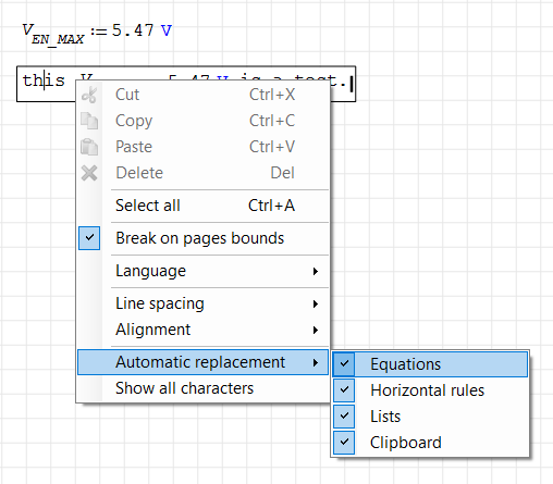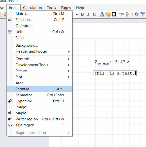 - Go to the variable that you want to insert into the text field and make sure it is evaluated, i.e. it shows an equal sign after it with some valid value & units. For example, I might evaluate the variable Vin such that it appears as "Vin = 5V" in the worksheet.