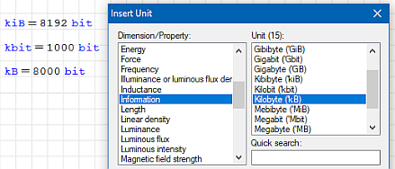 Форум SMath SMath Studio Feature Requests Units of information 1 страниц (2 вхождений) Units of information - megabyte & mebibyte etc - Сообщения К последнему сообщению #1 Опубликовано: 25.04.2023 02:29:37 Valery Ochkov 65 сообщений из 671 понравились пользователям. Группа: User It would be nice to insert these units of informationhttps://en.wikipedia.org/wiki/Byte#Multiple-byte_units #2 Опубликовано: 25.04.2023 09:49:33 Alvaro 1 078 сообщений из 1 750 понравились пользователям. Группа: User WroteIt would be nice to insert these units of informationhttps://en.wikipedia.org/wiki/Byte#Multiple-byte_unitsThose are here:Best regards.Alvaro. 1 пользователям понравился этот постDavide Carpi 26.04.2023 05:53:00 1 страниц (2 вхождений) Новые сообщения Нет новых сообщений