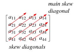 I can call each by its element, but I would like it to work for any a1n & an1, I can do tr(reverse) to find the secondary diagonal, after each reduction of the matrix by 1 row/column:
