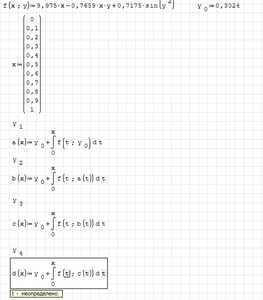 в методе последовательных приближений, как известно, нужно строить каждое решение с использованием интеграла от предыдущего. в процессе решения возникла такая проблема (на скриншоте). причем, он пишет, что "t неопределено" только для b(x) и d(x)
