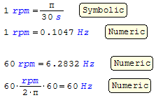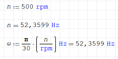 I've seen a few threads on this forum discussing the confusion with rpm unit. I'm not going to claim that this unit has wrong definition in SMath since it looks like it's just defined differently than one might expect. Anyway, can you tell me how to convert rotational speed in rpm to angular velocity in rad/s without having to get rid of units in the whole document ? I need a correct value of angular velocity for further calculations.