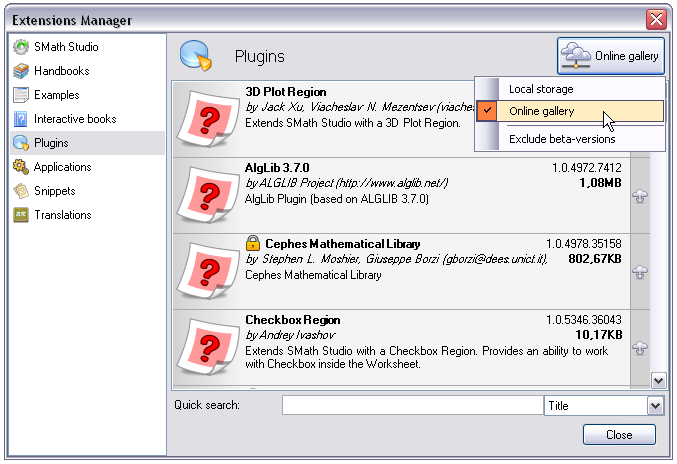 Go to "Tools" > "Plugins..." > "Online Gallery" and download the plugins you need. They will be installed in the %APPDATA% folder (C:\Users\\AppData\Roaming\SMath Studio in windows 7).
