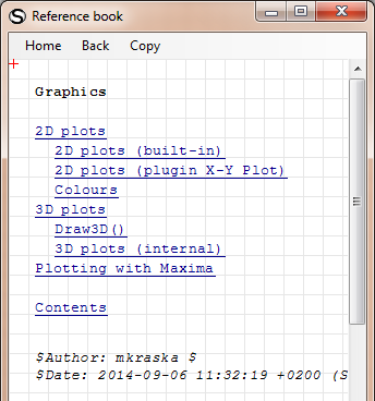A further help is inside the extension mangager (Tools > Plugins...) > Interactive handbooks; here there is the SMath Studio Handbook, that contains a Graphics section. (You have to download it, set it to use as default, then will be available from the Help > Reference book... menu)
