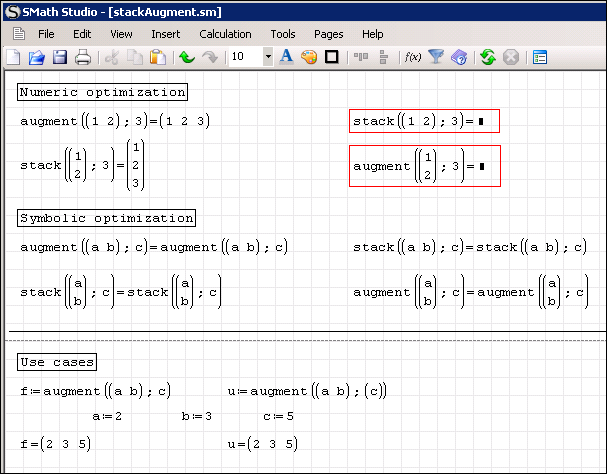 We had to make "a" and "b" variables as single element vectors. It seems to me a bit redundant. Andrey, could you make that augment() and stack() could have scalars as their arguments as well, in the cases of merging row or column matrices (vectors)?