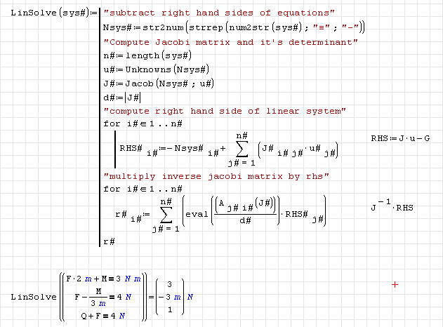LinSolve() provides an alternative for "hand made" sparse linear systems, as they typically occure in basic engineering mechanics. For densly populated systems, the matrix notation of the system might be more appropriate.