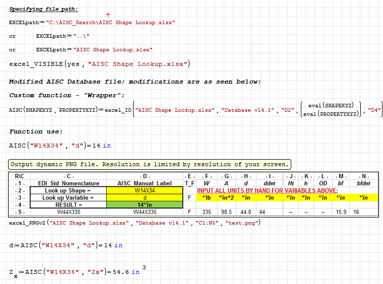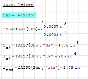 Alex formulated a simple function (aka wrapper) in order to input a shape's name and retrieve whichever property you would like. My two (minor) issues with this is that 1.) I generally need all the properties of the shape (mostly because I will incorporate torsion/warping into my calculation) so it was a bit tedious/ugly to have to call the function multiple times. But I did do this and it worked (thanks Alex!). 2.) So I took it one step further to hide it in a function (uh-oh, nobody likes this). I apologize as I think this has muddied the waters. I do appreciate the transparency of SMath calcs (as I think we all do), but I also like to be able to repeat a calculation on a single .sm page. Therefore the need for the function.