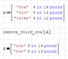 For example let's say that I have a matrix with the first column containing all text, the next column contains numbers with units of inches, and the next column has units of pounds. I want to create a new matrix but I want the entire 3rd row removed. I also want to keep the appearance of the units (i.e. text, inches, lbs).