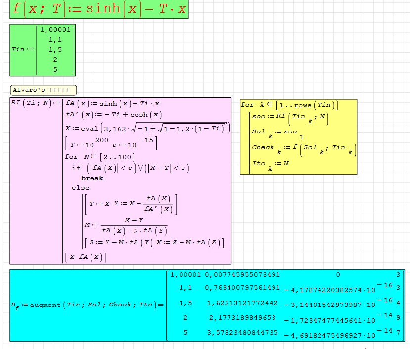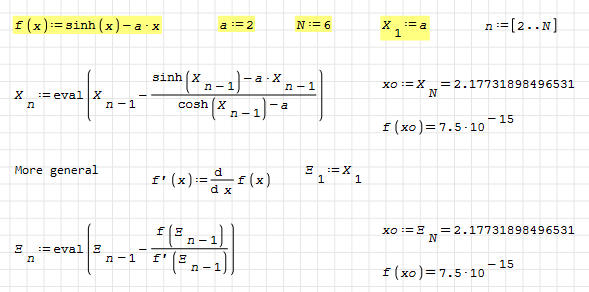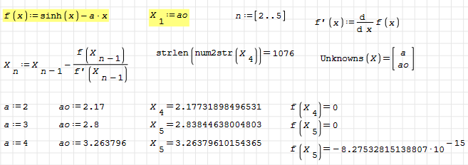 • For the starting value of the variable, you used simply the “a” value. For the starting point, I obtained a simple value based on the development of the second order of the hyperbolic sinus. Such a starting value diminish significatively the iteration number. You give arbitrarily a number of iterations; I control the convergence inside a “while” cycle.
