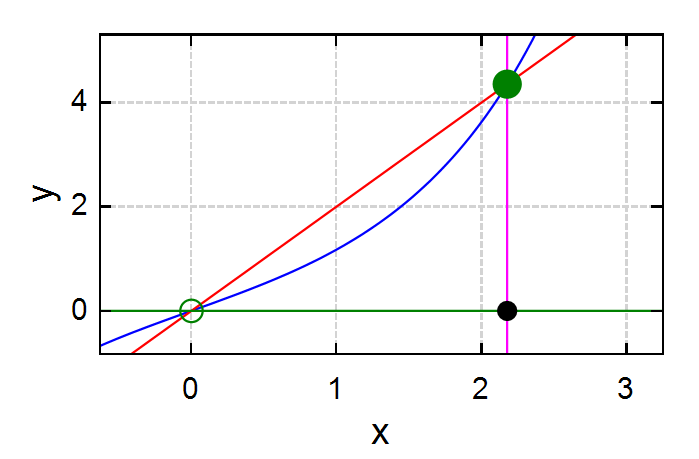 3. I looked for an explicit mathematical solution, in order to avoid iterations. Really, it’s more a caprice than a necessity. Basically, I hoped to have a simple formula for the intersection of a hyperbolic sinus with an inclined line, but I see that mathematics ways are as well simple as complicated…