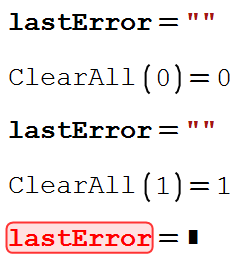 ClearAll() affects the built-in variable lasterror, depending on the argument provided. Yet, the description doesn't mention any significance of the argument and also promises not to touch pre-defined objects.