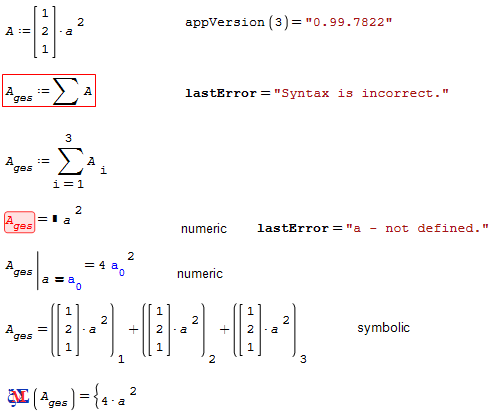 WroteHi Martin. "a" is not assumed as complex, like in maple, thus don't populate across dot products. (I remember some comment from Andrey about that somewhere). You need to use vectorize.