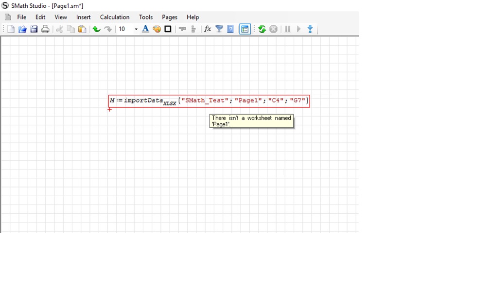 Hi Tate. The word unavaible "Page1" worksheet isn't about a SMath file, it's about a "Page1" worksheet in the "Excel workbook" named "SMath_Test" (without extension), which I guess that don't exist too (because the name of the Excel file requires the extension, not only the name).