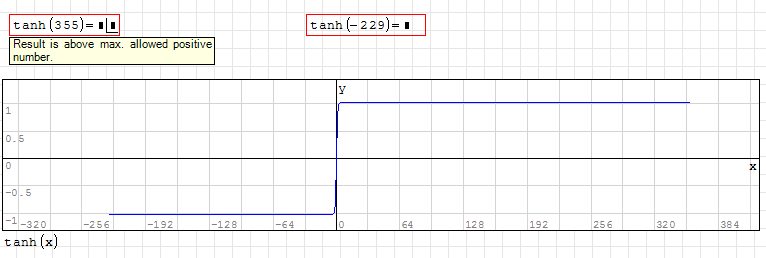 Seems that tanh(x) returns a "number above the max" error if x > 354, a "division by 0" error if x < -228 (reported as BUG SS-2284)