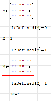 when an error is thrown the result is not stored -> this means that in SMath Studio is not possible to define a matrix with empty placeholders -> your IsAssigned will never works under these assumptions...