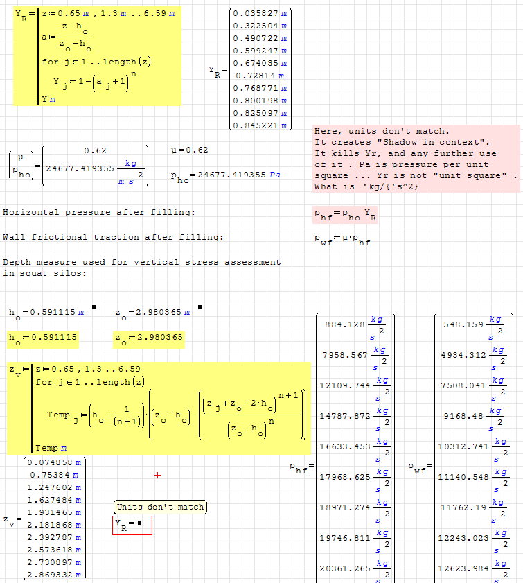 I am creating this file from scratch and it is the first time I am using SMath. So I have to complete all the equations and variables and definitions. Then I will decorate the sheet with what it needs (silo sketch, codes used, header and footer (actually I need help for print settings), etc.). It is a time consuming process as I used mathcad for this type of calculations before. If you have sample calculation report for a steel silo or another structure created by SMath, it would be very helpful for me.